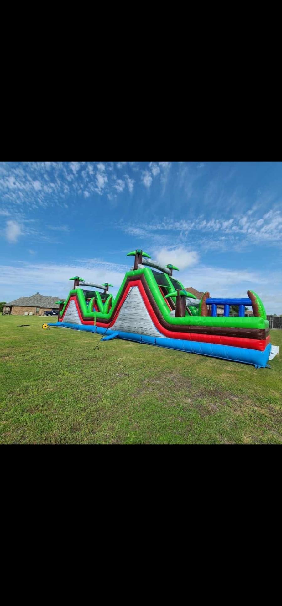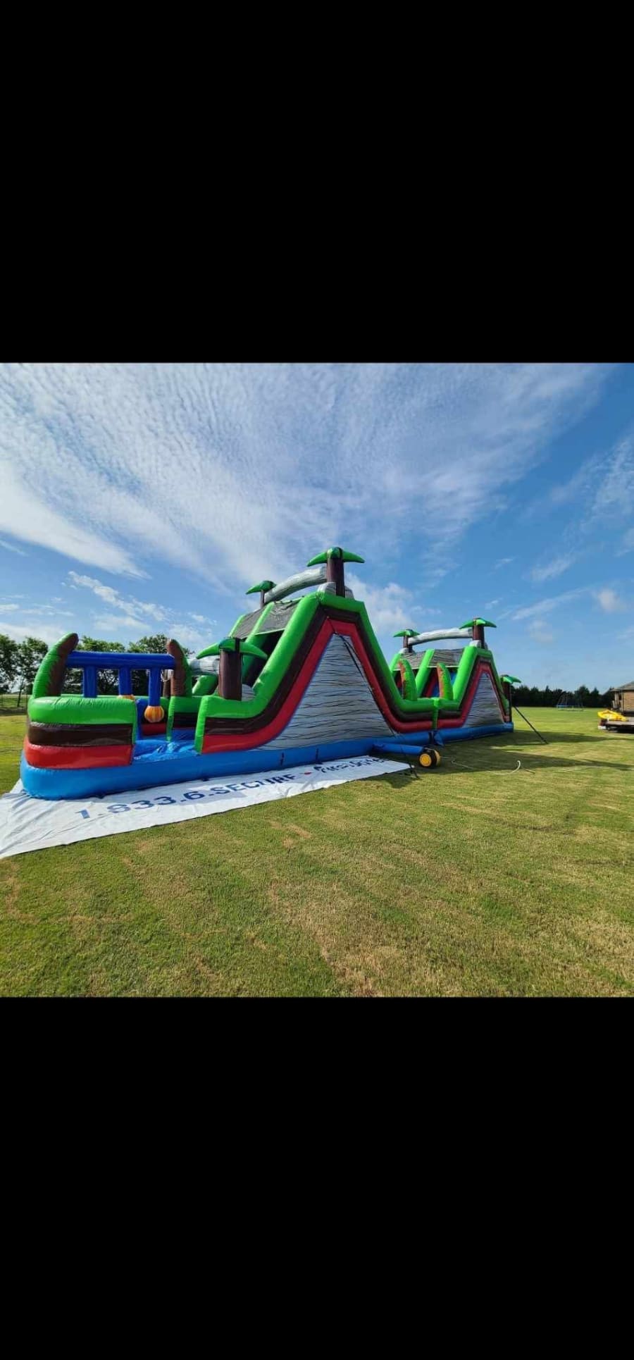 Bring high-energy fun to any event with the Tropical Obstacle Course. This inflatable is 65ft long and features an 18ft tall slide. It works wet or dry. Ideal for birthdays, school events, community fairs, and corporate outings. We provide a tarp and a 50ft extension cord with every rental to simplify setup. 🚚